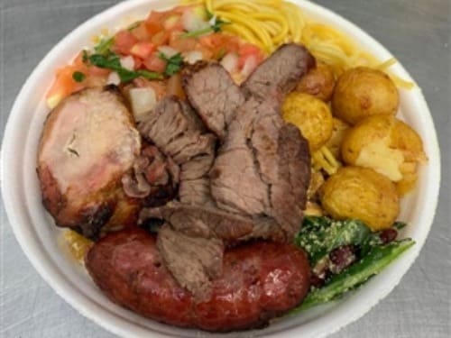 Pesa 1,000kg, sendo700g de comida (arroz,feijão, macarrão, legumesrefogados e farofa) e300g de picanha na brasa